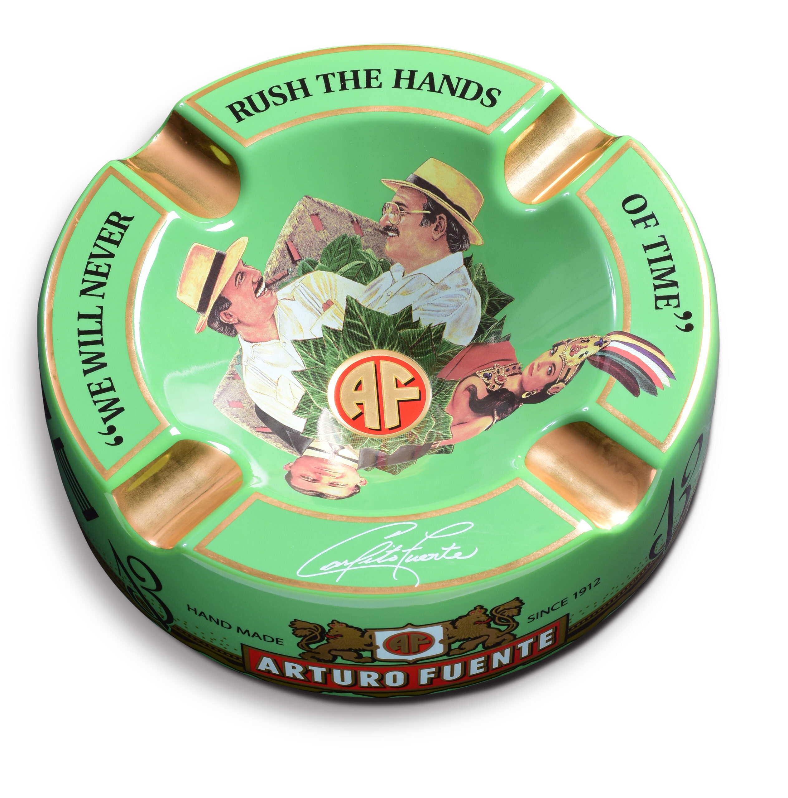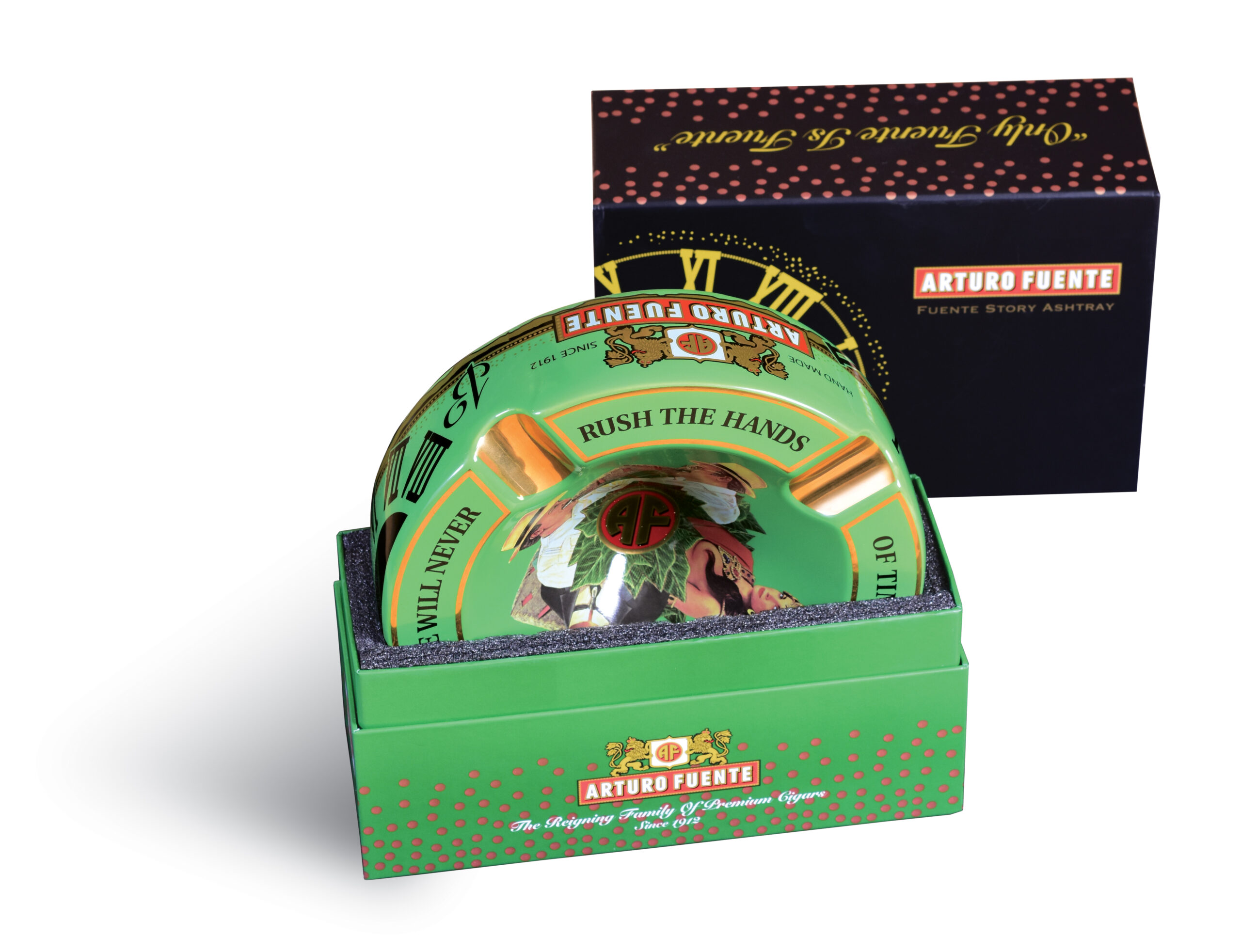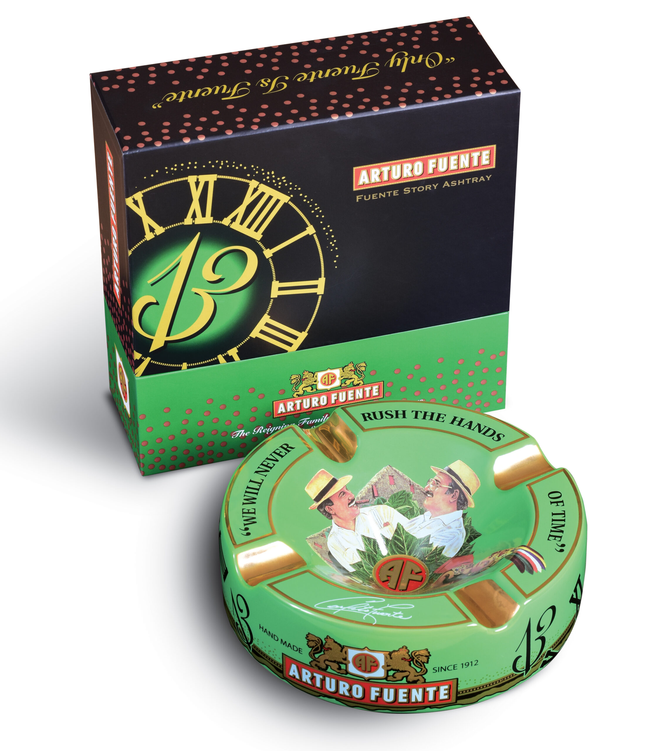 The Arturo Fuente Green Hands of Time Ashtray is a striking tribute to the legendary cigar brand and its legacy. Crafted from heavy, high-quality ceramic, this four-cigar ashtray features the iconic green “Hands of Time” artwork at the center—symbolizing the Fuente family’s generations of dedication to the craft. With deep cigar rests and a substantial feel, it’s both a functional smoking accessory and a collectible piece of Fuente history, perfect for any cigar lounge, office, or home humidor setup.